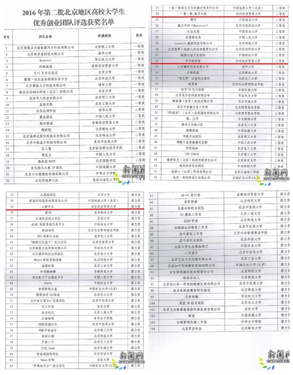 校新闻讯(记者 晨欢)近日,北京市教育委员公布了2016年北京地区高校大学生优秀创业团队第二批评选结果,我校三支创业团队榜上有名。其中,“一带一路 留学中国”项目团队获二等奖, “华尔街学堂”项目团队获三等奖,“U健平台”项目团队获潜力奖。