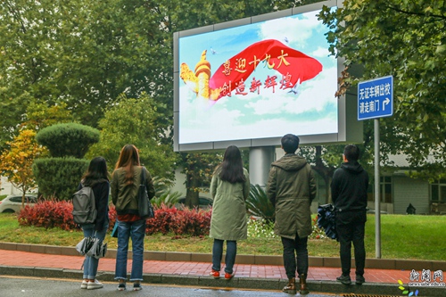 同时,全校各单位还利用布标横幅、电子屏、多媒体设备等悬挂、播放宣传标语,积极营造庆祝十九大胜利召开、学习贯彻十九大精神的浓厚氛围。