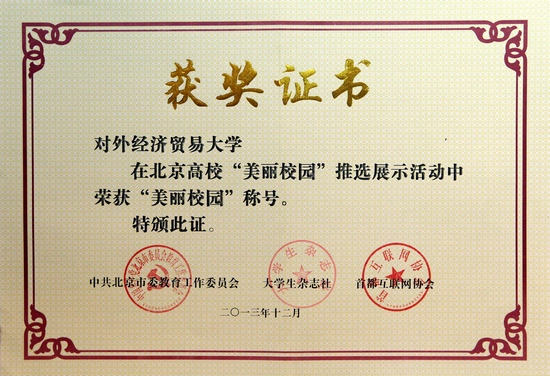 校新闻网讯(记者晨欢 摄影 玉君)2013年,北京市委教育工委联合大学生杂志社、首都互联网协会开展了“我的美丽校园 我的青春梦想”北京高校十佳美丽校园评选活动。经过师生评审团材料评审、实地体验,综合微博展示、网络投票及专家评审等环节综合评定,我校荣获“美丽校园”称号。