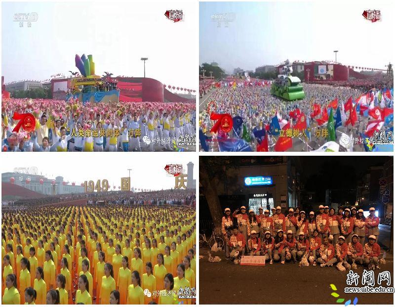 迎祖国七十华诞之际,我校开展了丰富多彩的校园活动,3000多名师生参与其中。10月1日,近千名贸大师生走上长安街,光荣承担了“人类命运共同体”“立德树人”方阵游行、广场合唱和志愿者服务等四项任务。“人类命运共同体方阵”有444位贸大人,包含30名教师和414名学生。“立德树人”方阵共有205位贸大人,包含14名教师和191名学生。游行队伍中,有年龄最小的00后,也有经历三次国庆游行的70后。自7月下旬开训以来,参训师生一起战骄阳、斗酷暑,高效完成了多项训练任务和彩排。为了发挥党员先锋模范作用和党支部的战斗堡垒作用,游行方阵申请成立了临时党支部。在训练中,所有党员佩戴党徽亮明身份,发挥正能量。此外,我校72名师生参加了国庆广场合唱方阵。国庆当天,他们早上6点进入天安门广场,用饱满的精神、优美的旋律和嘹亮的声音唱响18首爱国经典歌曲,为伟大祖国献上来自贸大人的生日祝福。镜头外,还有198名贸大志愿者们默默耕耘,他们坚守在灯市口地铁站、临场安检、东方广场南广场等岗位,经过20项不同主题的培训、4次演练、超2万小时志愿时长,用微笑和真心服务,用汗水和倾情坚守,用满腔的赤子之心造就了一道盛典上的贸大风景线。学校领导十分重视国庆庆典相关工作,多次到现场指导工作,亲切看望、慰问参训师生,鼓励他们认真训练。参训师生不负希望与重托,以各自完美的表现,完成了庆祝祖国七十华诞的重任。这一天,贸大师生齐心,共赴家国盛会,用整齐的步伐、优美的舞姿、嘹亮的歌声,向祖国告白,谱写了与祖国共奋进的壮美诗篇,为新中国70周年华诞添上了浓墨重彩的一笔。