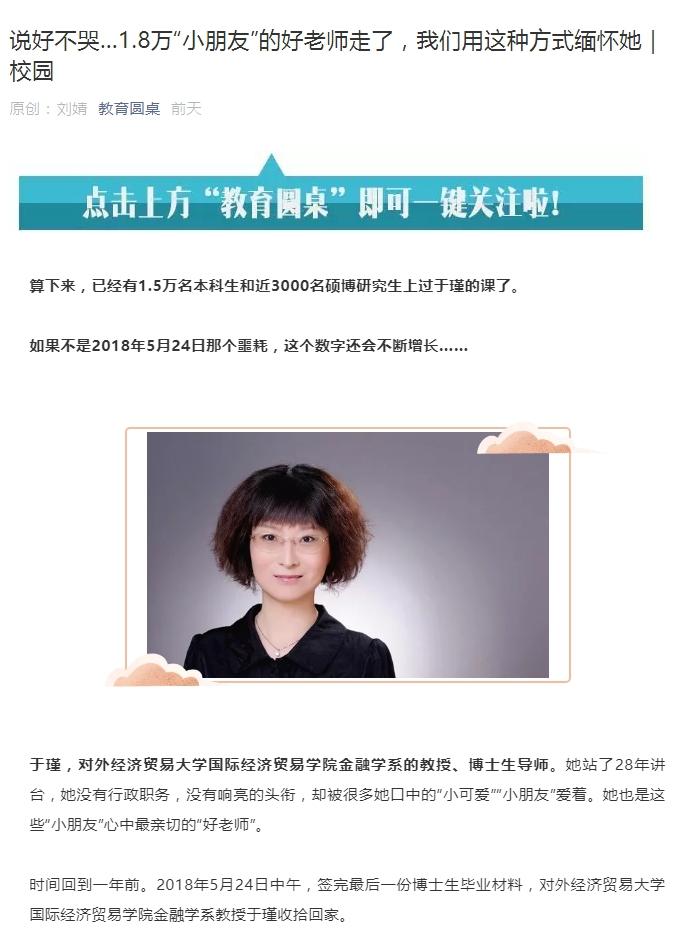 编者按:于瑾,一个讲课深入浅出、对学生关怀备至、深受学生爱戴的慈爱老师。《人民日报》、《光明日报》、《经济日报》等中央级媒体多次在专版头条刊登她的事迹;《中国教育报》3次在头版头条等显著位置报道,“中国教育报”微信公众号全文推送,事迹引发社会各界强烈反响,一天之内,《燃尽芳华照初心》点击量突破“10万+”,《中国教育报》移动终端访问量达35万;央视新闻频道《朝闻天下》栏目用“节如风竹清如柏”形容她,纪念她……