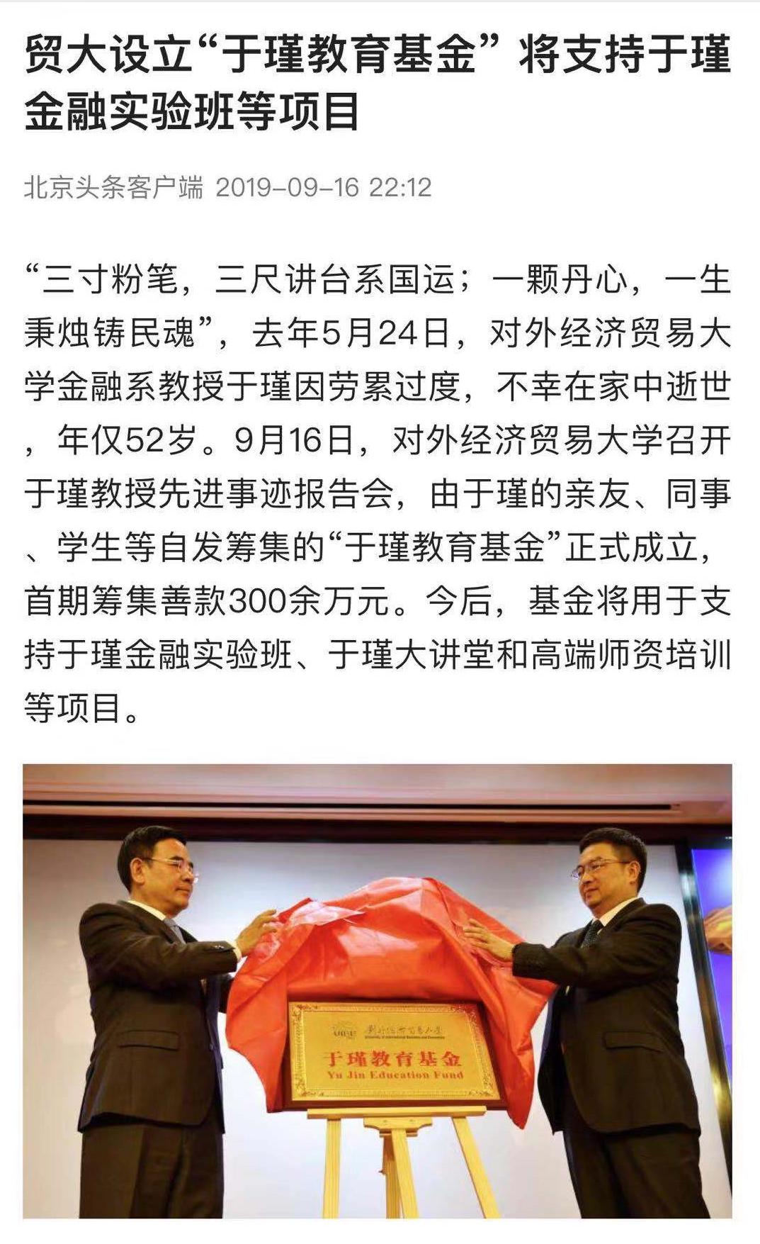北京头条客户端:贸大设立“于瑾教育基金” 支持金融实验班等项目