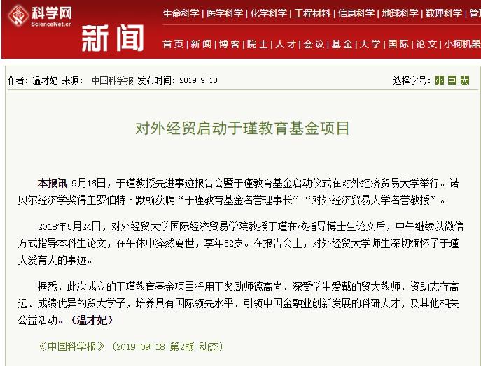 《中国科学报》(2019-9-18 第2版):对外经贸启动于瑾教育基金项目