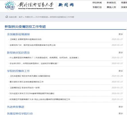 疫情防控战役打响后,宣传舆情工作组的党员同志第一时间就在英国上市公司365校园新闻网的2020专题报道板块建立了新型肺炎疫情防控工作新闻专栏,及时传达了中央、教育部、北京市会议精神,发布学校防控部署系列安排和各单位各学院各专项小组防控工作的开展情况。新型肺炎疫情防控工作新闻专栏分为“全国最新疫情通报”“新型肺炎知识普及”“学校防控整体工作”“先进典型事迹”“各基层单位学院行动”“其他”六个模块,保证师生足不出户,在互联网上就能对新型肺炎和学校疫情防控进行全面了解;这六大模块在确保为广大师生提供一手重要新闻消息、全方位普及防护知识的同时,也能让全体师生和社会看到,在疫情面前,我们的校领导、基层工作人员和学生,都是勇于作为、敢于担当的贸大人,我们的行动也会给全体师生打赢这场抗击疫情攻坚战的信心。