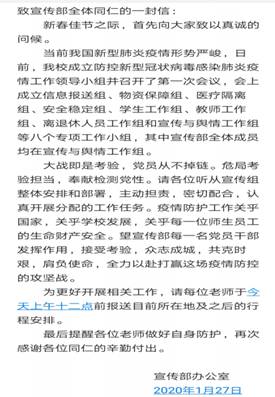 校新闻网讯(记者 晨欢 王峥)目前,全国正在紧张开展应对新型冠状病毒感染的肺炎疫情的工作,党中央、国务院高度重视,习近平总书记作出重要指示,为我们全面做好疫情防控指明了方向、坚定了信心,为加强对新型冠状病毒感染的肺炎疫情防控工作,更好地保障广大师生的生命安全和身体健康,我校宣传部校工会党支部主动担起非常时期的责任和使命,迅速安排部署,组织各方力量,积极落实校园舆情和疫情防控的宣传教育和引导工作。