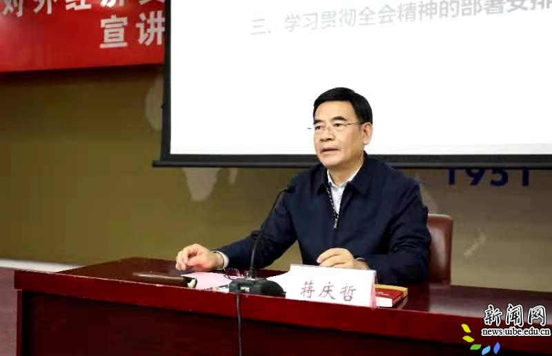 党委书记蒋庆哲作学习贯彻十九届五中全会精神首场宣讲报告。蒋庆哲从深刻认识党的十九届五中全会的重大意义、贯彻落实党的十九届五中全会精神,科学谋划贸大事业发展、党委关于学习贯彻党的十九届五中全会精神的部署安排和工作要求等三个方面分享了学习五中全会精神的体会。