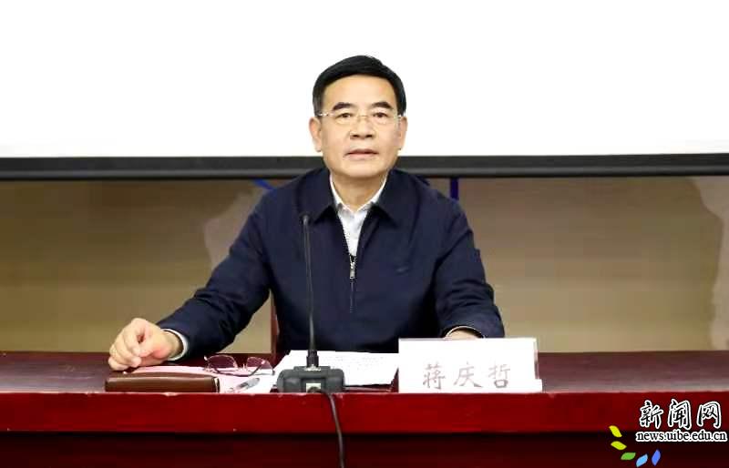 蒋庆哲书记指出,深刻认识党的十九届五中全会的重大意义,就是要认识到中国共产党第十九届中央委员会第五次全体会议是在我国将进入新发展阶段、实现中华民族伟大复兴正处在关键时期。学习领会好、宣传贯彻好全会精神和习近平总书记重要讲话精神,是当前和今后时期全校师生的首要任务。蒋庆哲特别强调,必须做到围绕一个主题,面对“两个大局”,学好“三个文件”,掌握“四个全面”、“五个新发展理念”、“六新”发展目标,抓好“十二个领域的重点改革任务”,并作出详细解读:“一个远景目标”是到二〇三五年基本实现社会主义现代化;“统筹两个大局”即全党要统筹中华民族伟大复兴战略全局和世界百年未有之大变局,这要求我们在工作中要更深刻认识我国社会主要矛盾变化带来的新特征新要求,增强机遇意识和风险意识,抓住机遇,应对挑战;学好“三个文件”是指全校要重点、全面学习《中国共产党第十九届中央委员会第五次全体会议公报》、习近平关于《中共中央关于制定国民经济和社会发展第十四个五年规划和二〇三五年远景目标的建议》的说明、《中共中央关于制定国民经济和社会发展第十四个五年规划和二〇三五年远景目标的建议》三个重要文件;把握“四个全面”新布局要求我们要了解“四个全面”概念的变化,即全面建设社会主义现代化国家、全面深化改革、全面依法治国、全面从严治党的四个新布局要求;深入领会“五个新发展原则”就是要坚持党的全面领导、坚持以人民为中心、坚持新发展理念、坚持深化改革开放、坚持系统观念这五个原则;实现“六新”发展目标即今后五年经济社会发展要努力实现经济发展取得新成效、改革开放迈出新步伐、社会文明程度得到新提高、生态文明建设实现新进步、民生福祉达到新水平、国家治理效能得到新提升;深刻领会“十二个领域的重点改革任务”即坚持创新在我国现代化建设全局中的核心地位、推动经济体系优化升级、形成强大国内市场,构建新发展格局、全面深化改革,构建高水平社会主义市场经济体制、全面推进乡村振兴、推进区域协调发展和新型城镇化、提高国家文化软实力、推动绿色发展、实行高水平对外开放、改善人民生活品质,提高社会建设水平、建设更高水平的平安中国、加快国防和军队现代化等方面全面深入了解,做到重点推进,稳步前进。