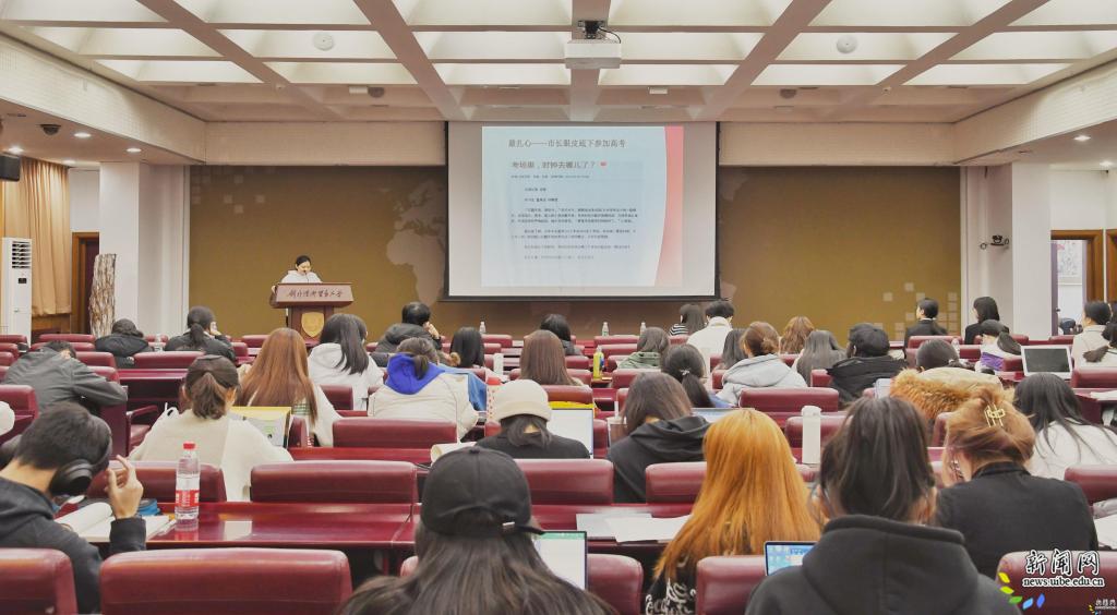 讲座伊始,王湘宁对任敏记者进行了介绍,并代表贸大宣传部欢迎她的到来。任敏是《北京日报》科教卫部记者,从事一线采编10年,最近7年主要负责国家教育政策以及高教领域报道,在校园热点捕捉、政策解读、会议新闻抓取、教育人物等方面具有丰富经验。任敏曾获多个新闻奖项,擅长人物通讯报道,她的不少精品在高校宣传领域获得好评与转载,多篇文章在新媒体平台上获得高阅读量。任敏表示,在自己的大学本科期间,校报记者团的任职经历让她学会了新闻采写中最基本的技能,如今这个经历成为了她赖以生活的资本。因此,应王湘宁的邀请,她希望将自己的相关经验分享给对新闻有兴趣的学生,为他们提供借鉴。
