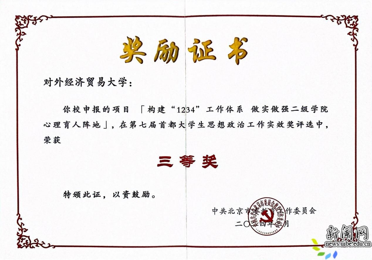 3月29日,市委教育工委公布了第七届首都大学生思想政治工作实效奖获奖名单,我校“打造‘五彩贸大’新媒体品牌 塑造网络思政教育新格局”项目荣获二等奖,“构建‘1234’工作体系 做实做强二级学院心理育人阵地”项目荣获三等奖。