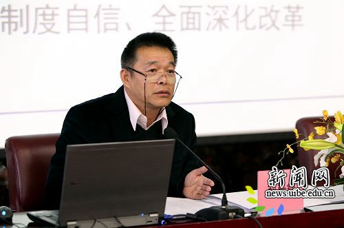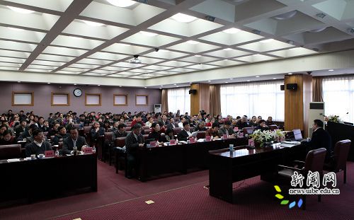 校新闻网讯(记者 湘宁 摄影 玉君)11月19日下午,为深入学习贯彻党的十八届三中全会精神,我校党委理论中心组召开扩大会议,邀请清华大学公共管理学院教授、国情研究院院长,国情研究与公共政策的著名专家胡鞍钢教授作十八届三中全会精神专题报告。校党委常委,校党委委员、纪委委员;全体中层干部;学系主任代表、教授党员代表、青年教师代表;统战人士代表;离退休老干部代表;研究生代表共200余人参会。王玲书记主持会议。