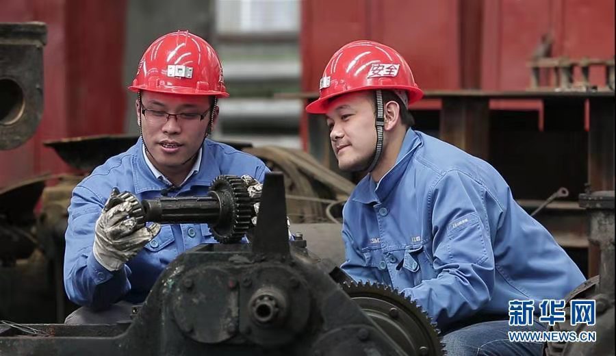 全国人大代表、山西焦煤西山煤电杜儿坪煤矿的董林(左)为职工讲解设备构造和传动原理(2018年4月25日摄)。新华社发