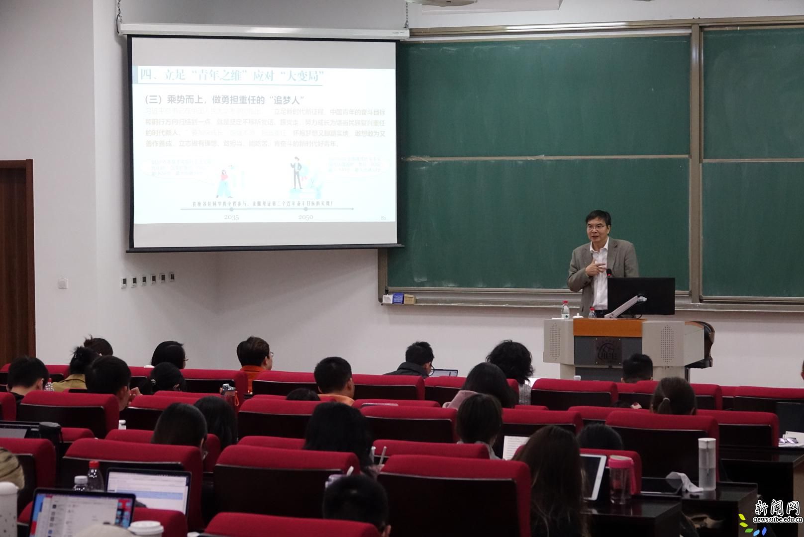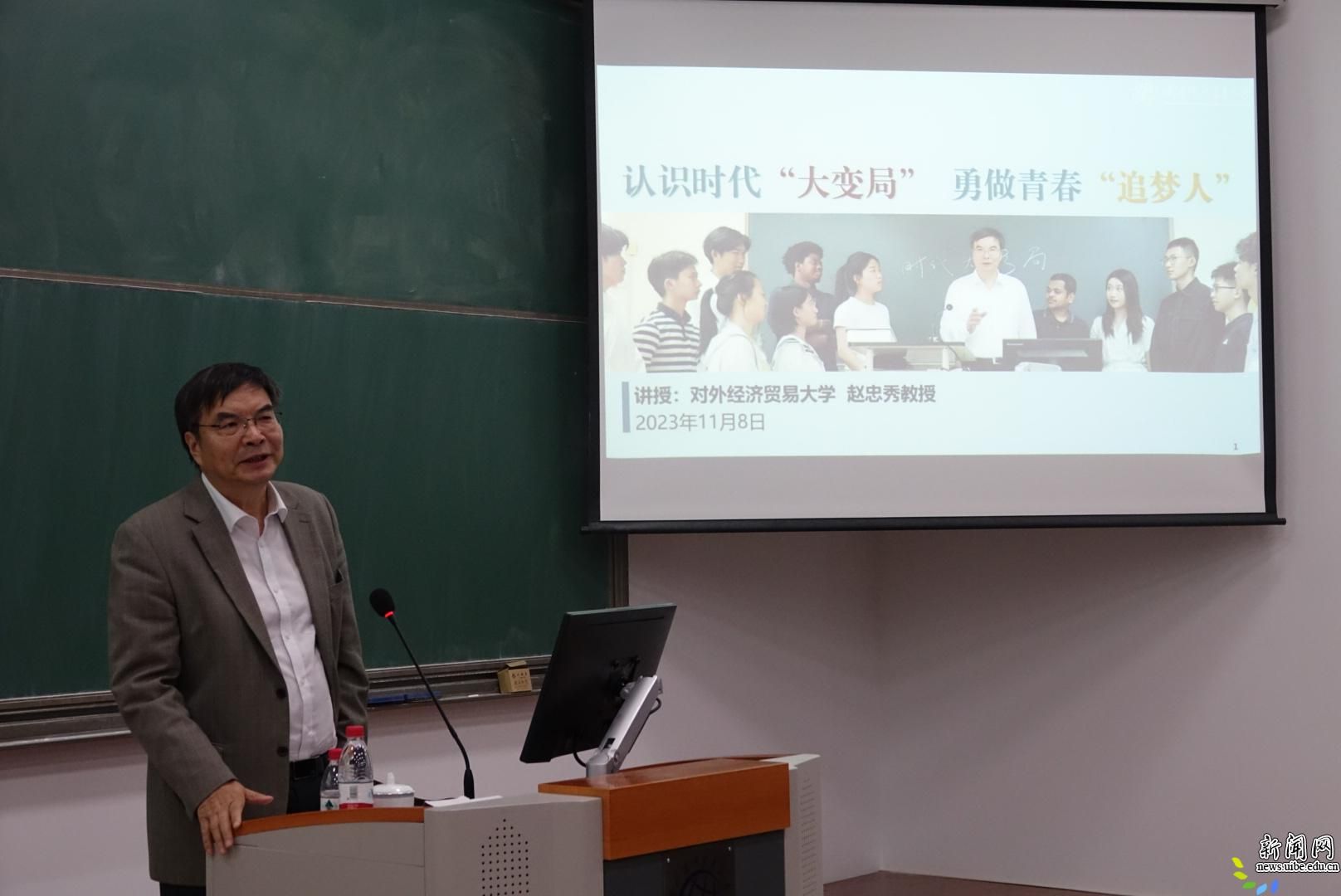 校新闻网讯(马克思主义学院 供稿)11月8日晚,校长赵忠秀教授走进《形势与政策》课堂,以“认识时代‘大变局’,勇做青春‘追梦人’”为题,为来自各学院的137名本科生讲授思政课。