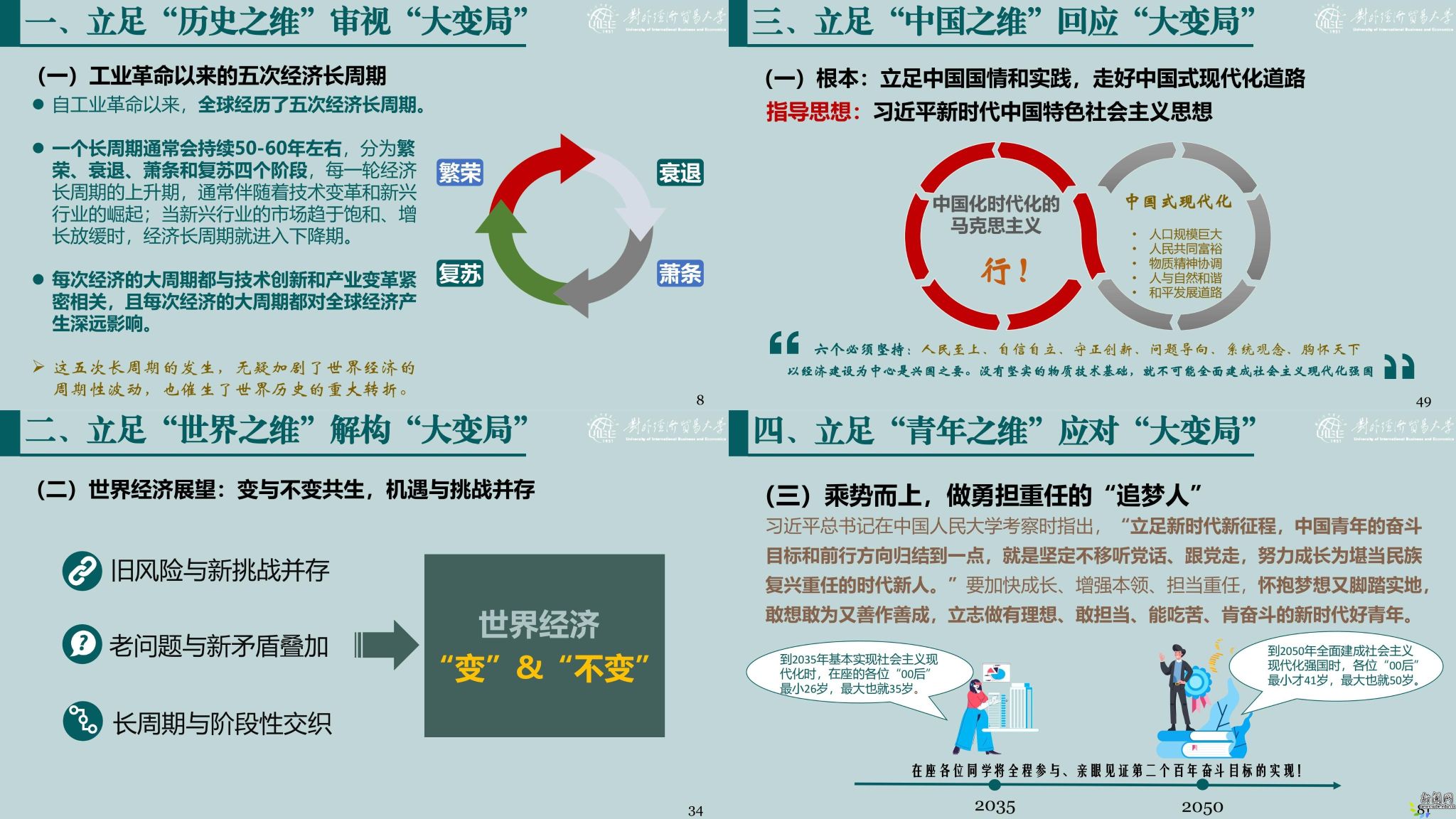 赵忠秀校长讲到,我们要立足“历史之维”审视“大变局”。他梳理了工业革命以来全球经历的五次经济长周期及其对经济格局变迁的影响,并以2008年金融危机加速发达经济体的相对衰落和新兴经济体的相对崛起为例,引导学生运用辩证思维看待当前世界经济在长周期中所处的萧条期阶段。随后,他通过对比社会主义和资本主义不同经济体制和产权制度在推动和制约技术创新和产业变革等方面的“不同点”,引导学生认识中国共产党以“人民为中心”的根本价值取向。